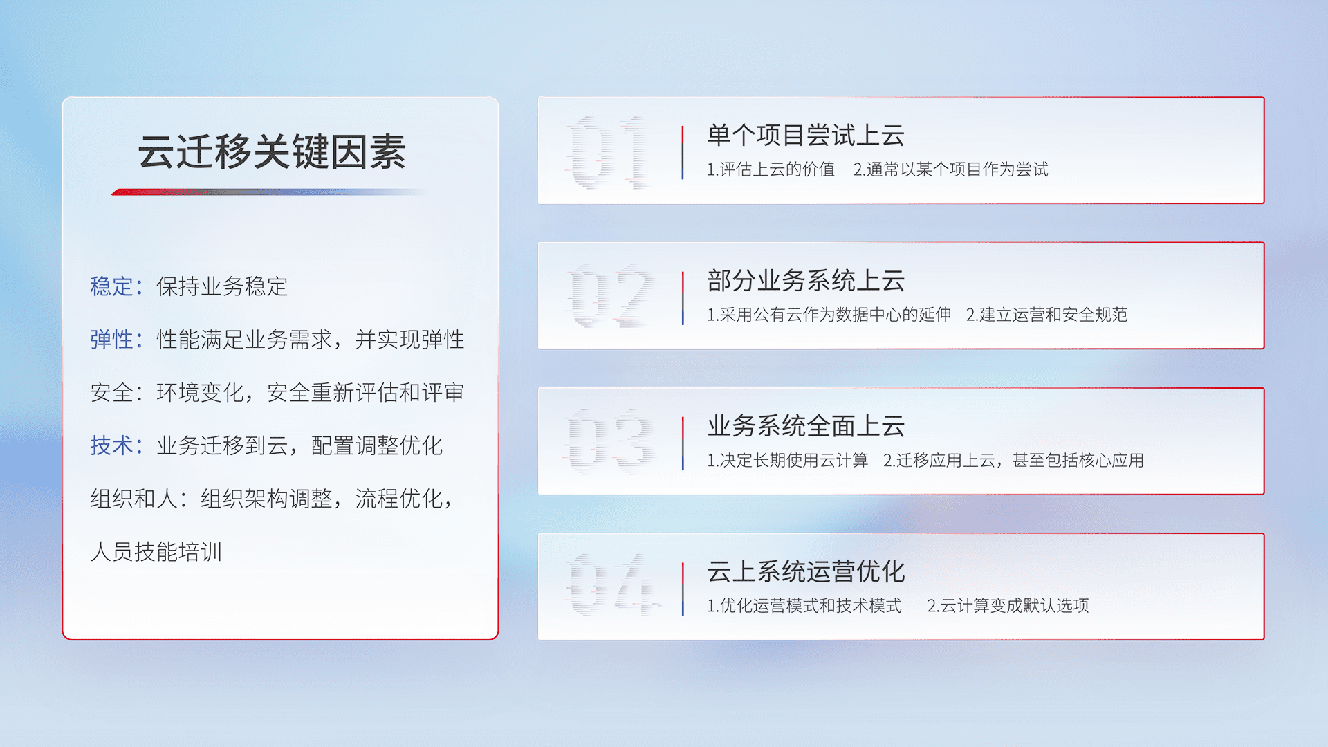 结合实际业务,,,从规划设计、、、云平台选型、、、、云原生改造、、、数据迁移、、集成交付,,,迁移全过程为客户识别最佳上云路径,,,,做好风险识别管理,,,,设计网络架构、、身份权限、、安全审计合规、、、操作审计、、、、日志审计、、、、监控告警策略、、多站点容灾设计等,,,,对云上基础设施进行整体规划,,,,提升IT治理水平,,,,以满足弹性、、、、高可用、、高性能的需求。。。。