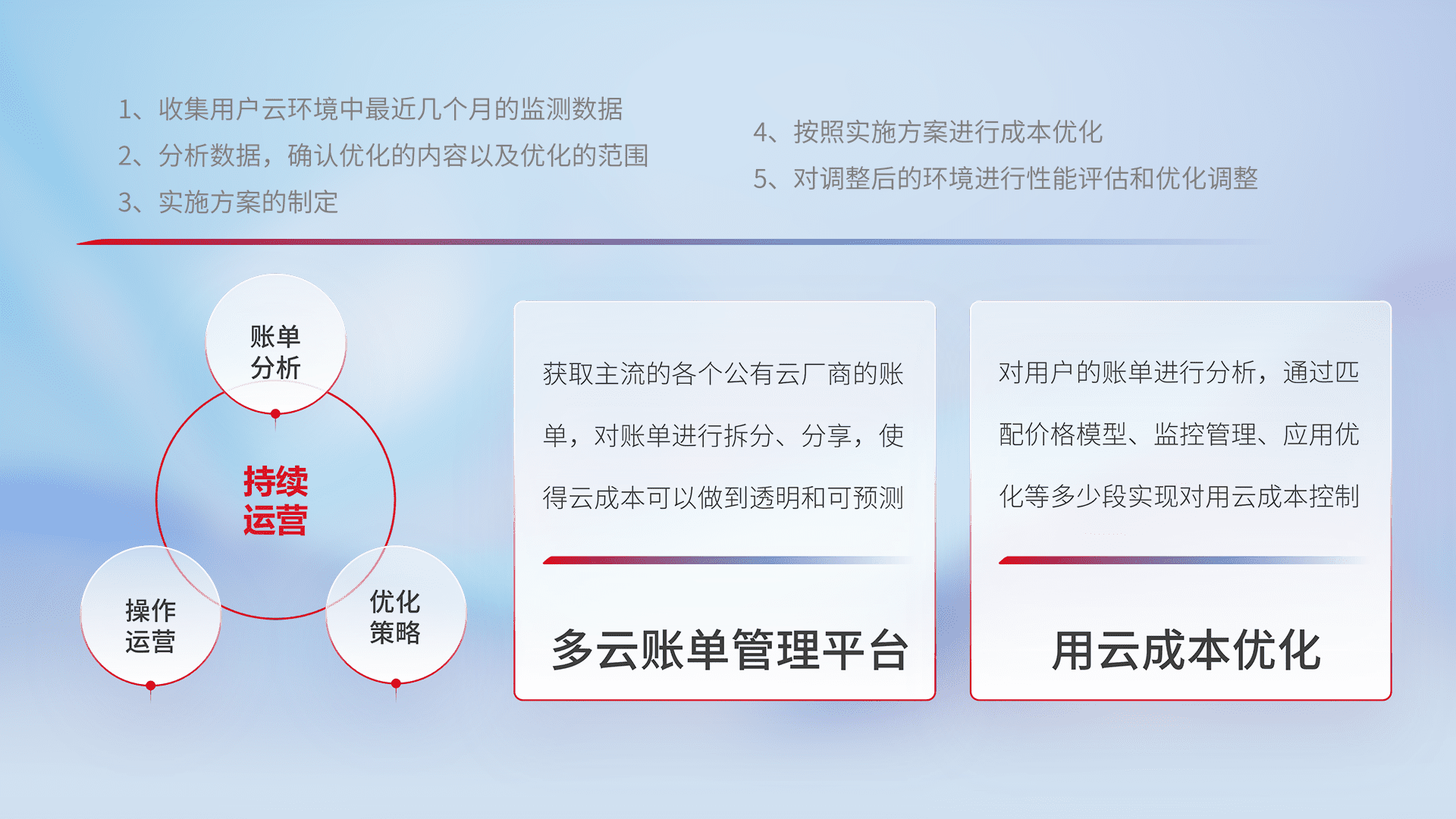 通过多云纳管,,以统一的资源数据模型把客户的云资源进行抽象和封装,,,,进而实现对多云资源的统一操作,,,,保障云资源管理的可靠性、、、、稳定性与可用性。。。。量身定制化运维内容,,配置、、、开发运维、、、补丁管理、、备份、、监控、、、、认证和访问管理、、、审计和日常巡检等,,,保障在用云过程中的可靠度,,,,稳定度以及高可用率。。。。