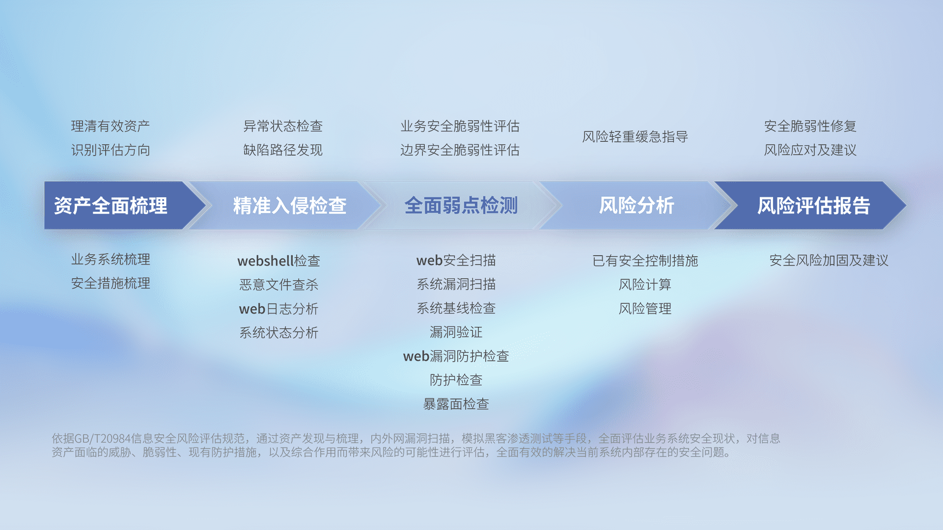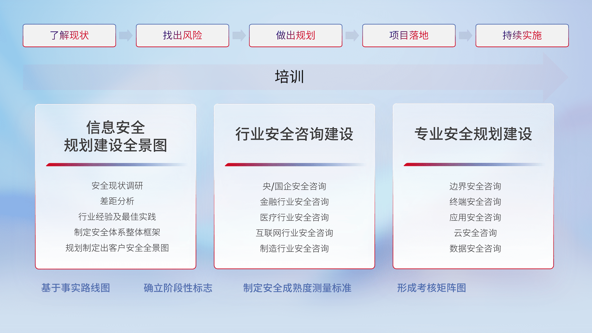 针对客户行业特性,,以专业的安全服务+多厂商联合解决方案提供专属的一站式安全管理服务,,,,帮助客户全面感知网络空间威胁,,基于识别、、检测、、分析、、防护、、、、监测、、、、响应的服务理论模型,,,,从方案咨询、、集成交付、、、评估验证、、、优化加固、、运维运营,,,致力于为客户提供完整的闭环管理式安全服务。。以实战经验为客户打造高抵御风险的安全体系,,,帮助客户发现威胁、、、对抗威胁、、、处置威胁,,不断积累安全对抗能力,,,,持续保障数字化安全。。。。